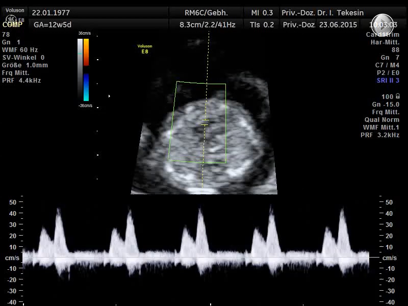 Die Beurteilung des Blutflusses in den kindlichen Gefäßen (Nabelschnurarterie [A. umbilicalis], A. cerebri media und Ductus venosus) ermöglicht eine Aussage zur Versorgung des ungeborenen Kindes. Die Doppleruntersuchung kann in unterschiedlichen Zeitpunkten der Schwangerschaft durchgeführt werden.